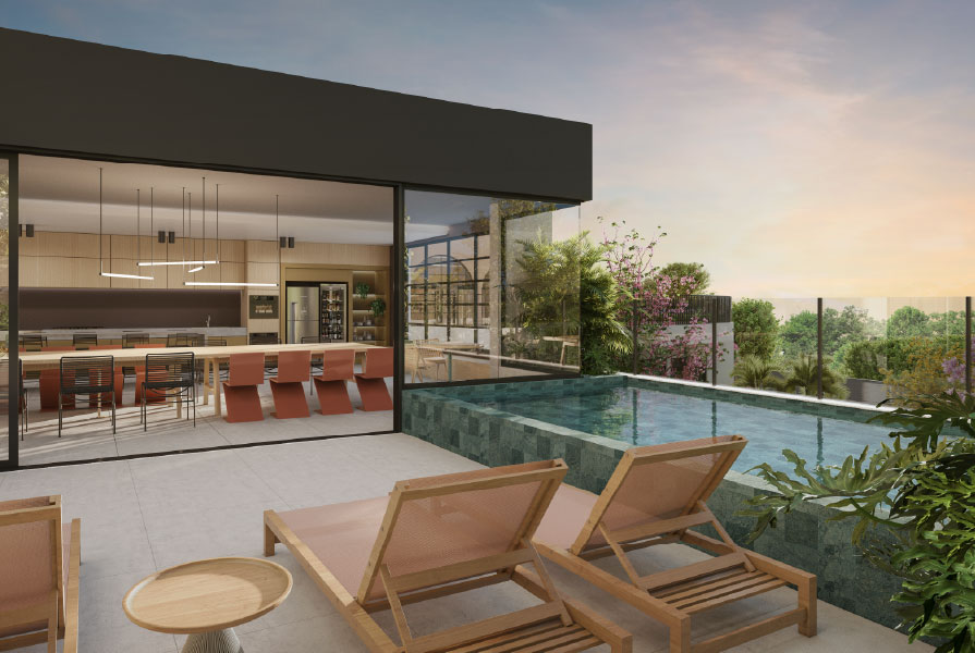 Wood também reúne uma série de espaços de lazer projetados fora da torre e conectados pelo jardim central. A Casa de Verão com Piscina Privativa e a Summer Kitchen com vista para o Parque Particular permitem receber convidados em um ambiente abraçado pelo verde. O Complexo Fitness mantém a relação com as áreas externas por meio de grandes aberturas, enquanto o Coworking com varanda ao ar livre amplia as possibilidades do dia a dia.