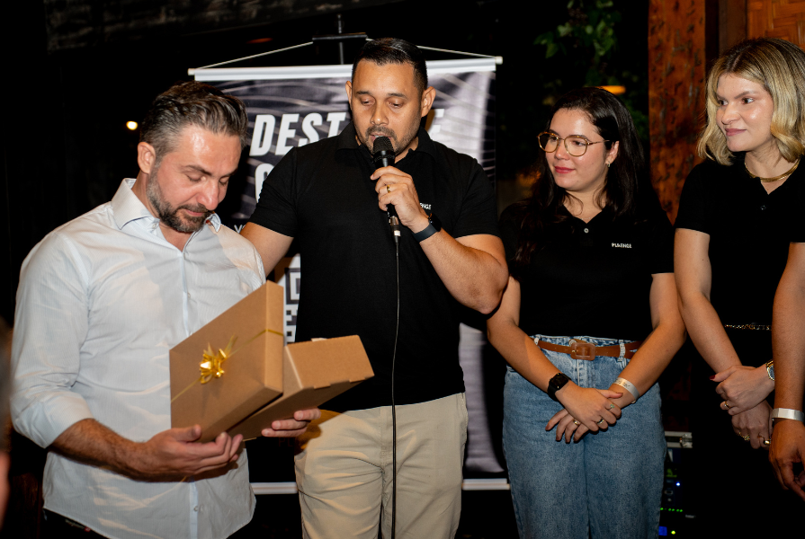 Entre um brinde e outro, a noite também teve um momento de despedida — ou melhor, de um “até logo”. O nosso gerente comercial em Cuiabá, Thiago Escobar, está de malas prontas para retornar à sua terra natal, São Paulo. Fica aqui o nosso registro de agradecimento pela dedicação e a certeza de que ele levará o calor de Cuiabá (literalmente e figurativamente!) para seus novos desafios.