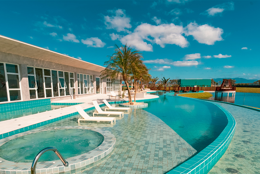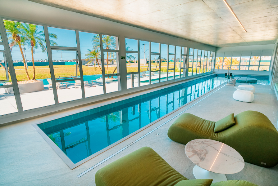 A área de lazer foi pensada para todos os momentos. A sauna compartilha da mesma vista panorâmica que a piscina térmica proporciona — um convite para relaxar e contemplar a paisagem. E na prainha, entre quiosques e areia, o clima leve do verão se estende por todas as estações.